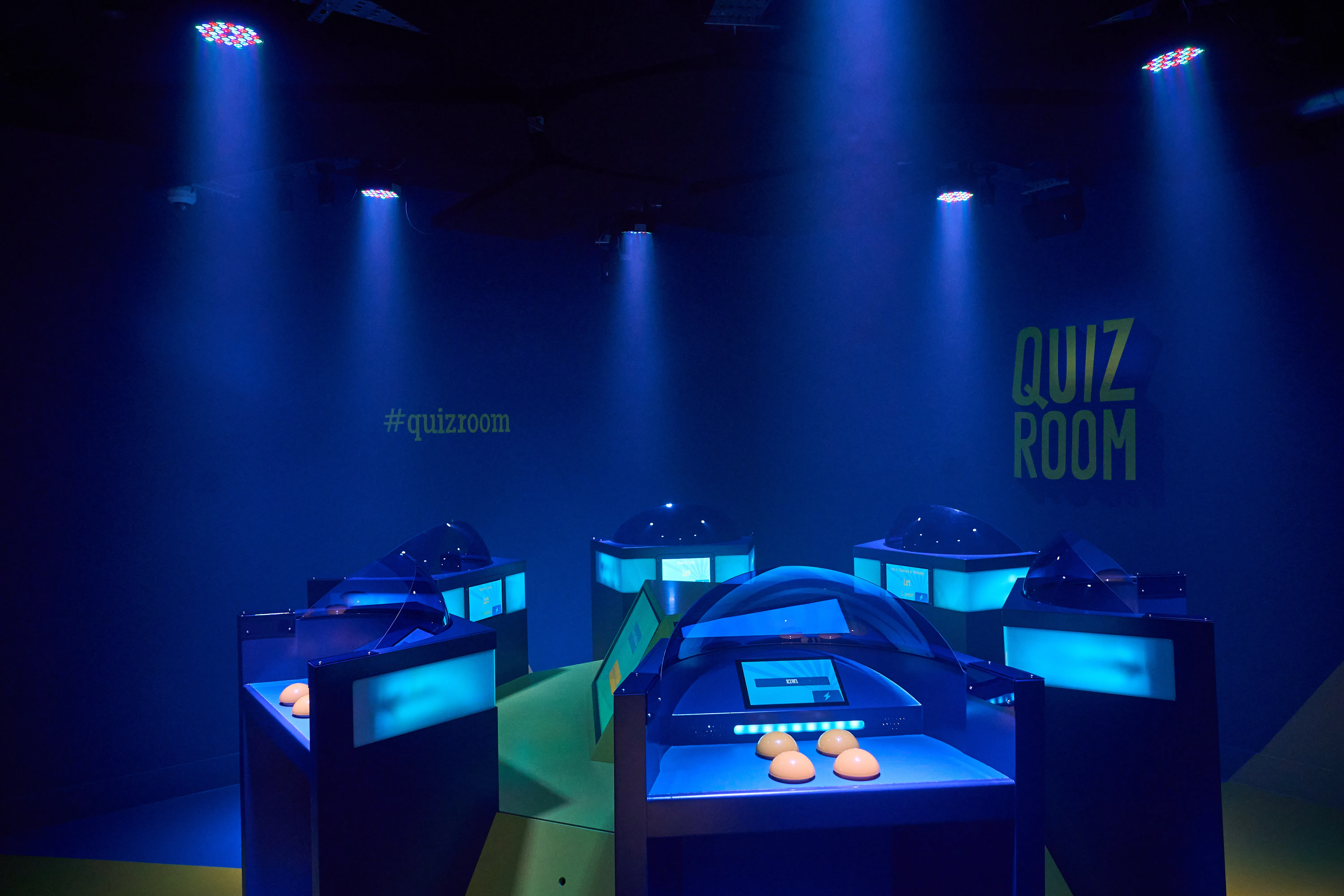 A quiz is a game of questions and answers. A questionnaire to test your knowledge on a specific subject or simply for general knowledge. At Quiz Room, quizzes are played by several people around 6 podiums, in a TV-style atmosphere: everyone competes against each other and uses their joker cards to strategize and win.